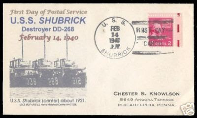 It can be seen here in as the centre of three destroyers on this first day cover. It was decommissioned in Jun 1922 and remained laid up until Dec 1939. See also USS Shubrick (DD-268)